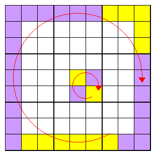If these centres are coloured alternately black and white we see also that the boundary visits white and black cells alternately. If there are equal numbers of white and black centres, (as there is for an m x n grid whenever either or both of m and n are odd, such as 9 x 9), then the first centre it vists after starting on the grid border must be an opposite colour to the last centre before it finishes on the border. Counting around the border, this will always mean that there are an odd number of border edge cells between the first and last boundary steps.